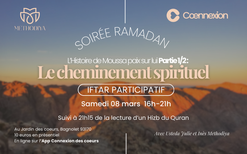 • 18h45 : Rupture du jeûne, salat et iftar participatif entre soeurs (groupe de 10-12 max) : chacune apporte une part et connecte son coeur au groupe 💓